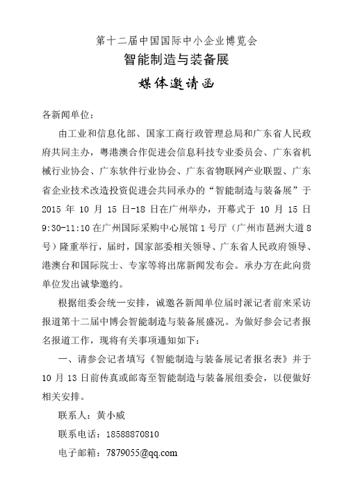 第十二届中国国际中小企业博览会智能制造与装备展媒体邀请函