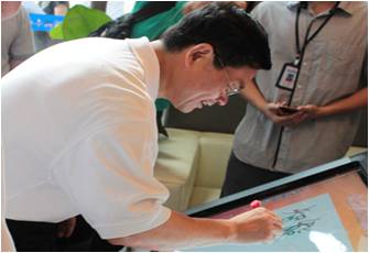 陈云贤一行来到物联网体验中心与研究院工程中心联合展示厅,在研究院常务副院长李鹰的带领下,陈云贤一行走进物联网体验中心区域,首先体验到物联网感知技术的鸟语花香智慧花展和通过物联网识别技术体验智慧签名平台,陈云贤亲笔为研究院题字:“智能广东”。紧接着参观了智慧交通车辆识别与车辆监控管理系统、智慧医疗领域、食品溯源平台、智慧农业系统等内容。随后,调研组一行参观了智慧城市展区,展区展示了广东省北斗应用技术支持中心智慧市政工程中心、多维仿真工程中心以及数字城镇工程中心的数字广东建设成果。