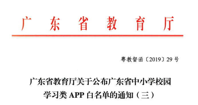 广东省教育厅组织力量统一审查,审查通过后将APP产品列入白名单。经广东省教育厅列入白名单的APP,视同为全省均已备案。对于广东省教育厅审查通过并列入白名单范围内的 APP,各地市、县(市、区)、学校和机构可以根据本地区、本单位实际情况,自主决定是否使用该产品,不需要市、县、学校逐级审查。 自2019年9月1日起,凡未在广东省教育厅审查通过并列入白名单的校园学习类APP,各地市、县(市、区)教育主管部门和学校等单位不得要求或推荐给中小学生使用。